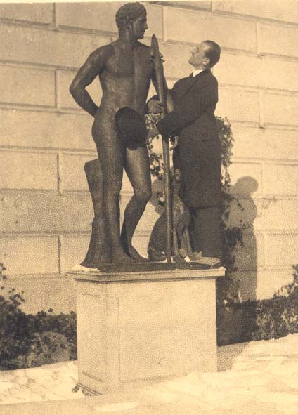*** Per fortuna ogni foto non sempre racconta una storia tragica. Come questa (FOTO 6), tedesca ma dei tardi anni '20 e di provenienza incerta. Ignorasi i giocondi impulsi irrefrenabili che hanno spinto un ricco borghese, in ghette e cappotto, ad arrampicarsi sulla statua in bronzo d'un bel Paride per coprirne le neoclassiche pudenda col proprio cappello. Quando si dice pudor pubis!